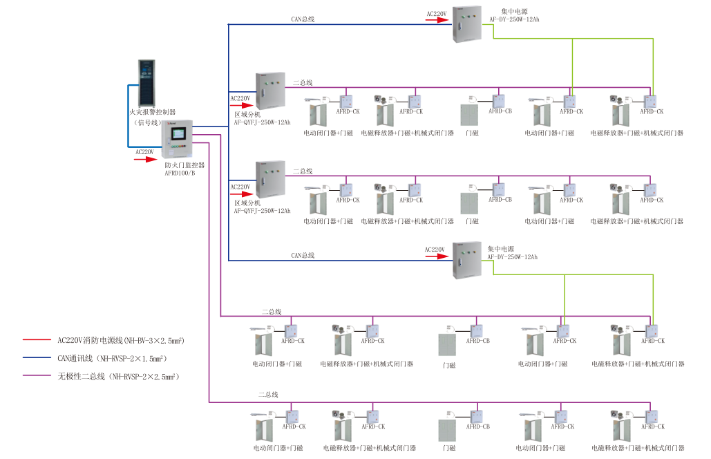 消防设备电源监控监控系统采用消防二总线,以建筑为单位设置区域分机采集消防设备电源状态,区域分机通过二总线接收多台传感器的电压、电流信息和开关状态信息,以此实现对消防设备电源工作状态的实时监视。