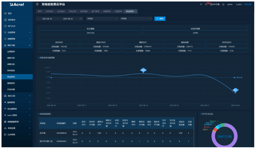 通过系统平台,从充电站点、充电设施、、充电时间、充电方式等不同角度,查询充电交易统计信息、能耗统计信息等。