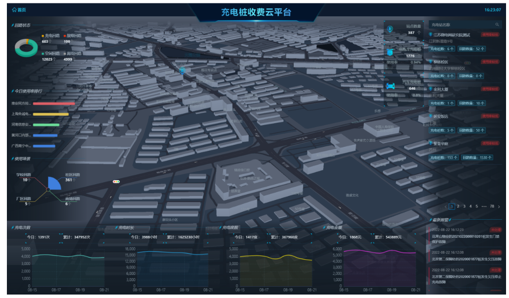 智能化大屏展示站点分布情况,对设备状态、设备使用率、充电次数、充电时长、充电金额、充电度数、充电桩故障等进行统计显示,同时可查看每个站点的站点信息、充电桩列表、充电记录、收益、能耗、故障记录等。统一管理小区充电桩,查看设备使用率,合理分配资源。
