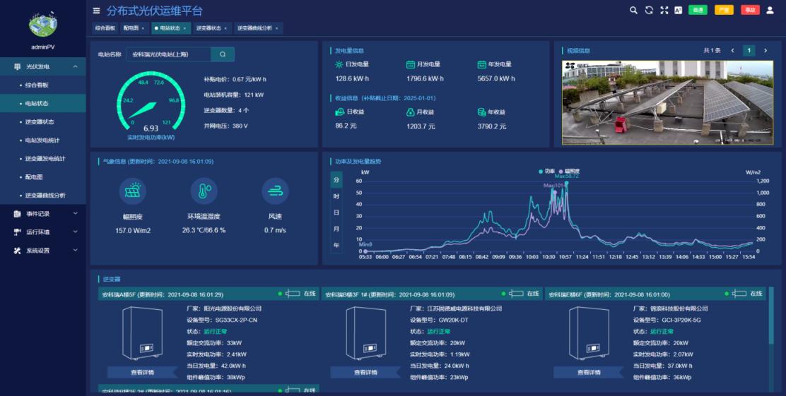 ●电站状态展示当前光伏电站发电功率,补贴电价,峰值功率等基本参数。