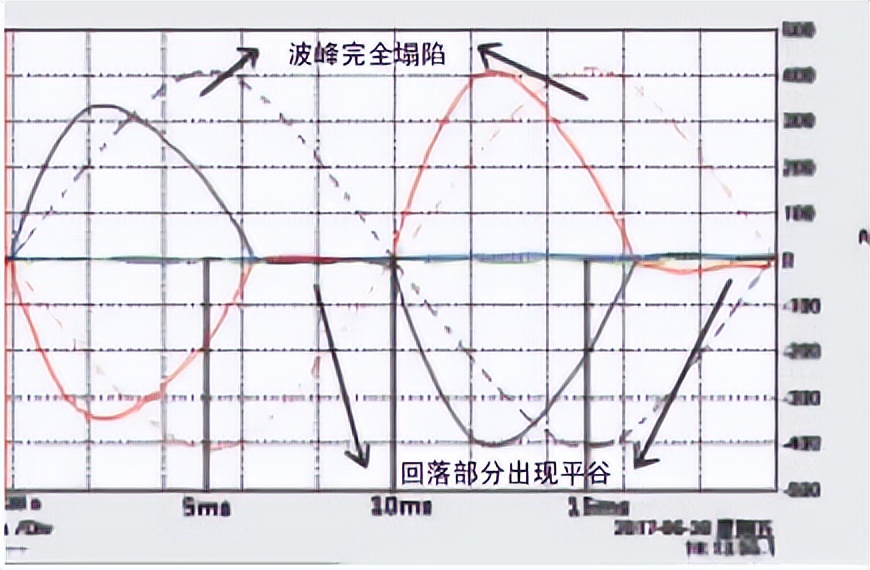 图2为焊机电流波形图(虚线为标准正强波电流应在用电开始后5ms时达到电流峰值,在10mms时归0,在15ms时达到反向峰值,在20s时再次归0,构成一个完整的周波,在一个周波的用电时间内,电流波形应该过渡平滑。可以看出,焊机实际波形比标准正强波形更早出现了波峰,在5ms峰阶段,焊机波形此时已经处于回落状态,并出现了长时间的平谷,此时电流值为0。通过对比不难看出,焊机的电流波形已经W全不是正弦波形,负载电流中含有大量的谐波电流,导致焊机电流波形畸变严重,会对电力系统造成严重影响。