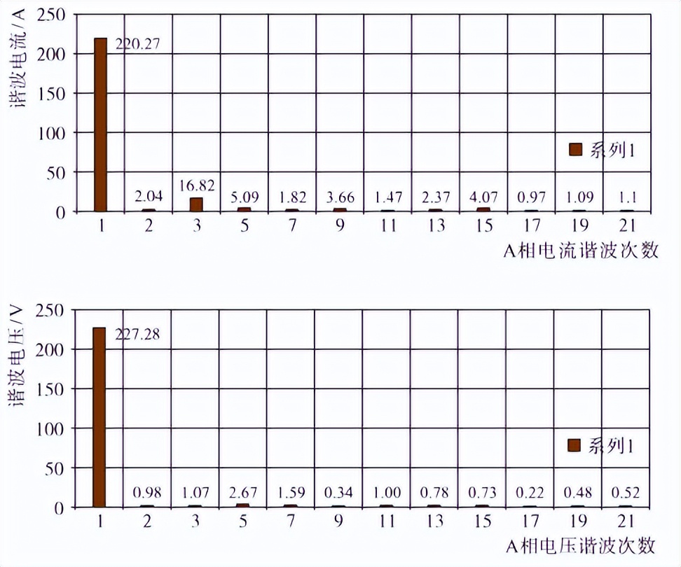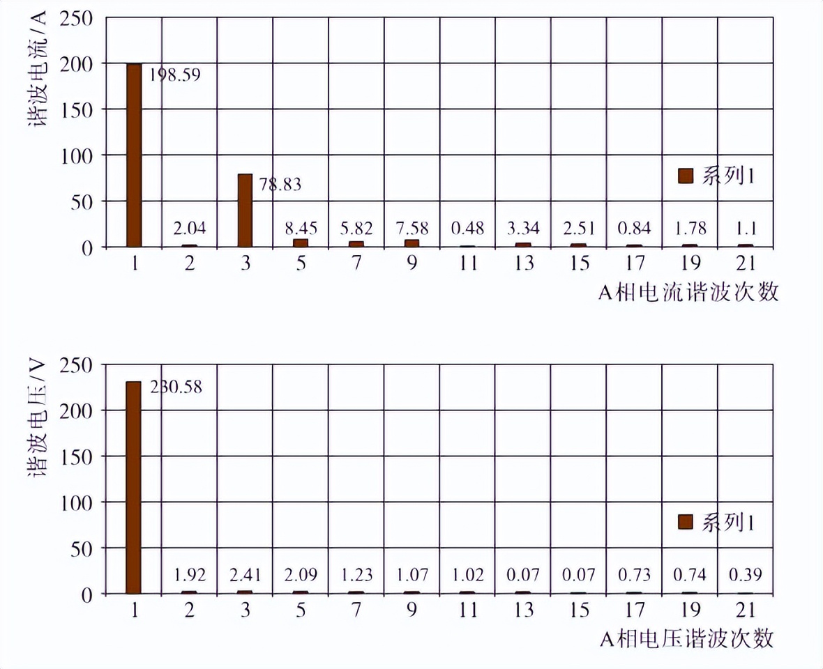 图3分别为A相的谐波电流柱状图和谐波电压柱状图,从柱状图中可以看出谐波主要由3次谐波构成,5、7、9次谐波比较小,电压也有一定的谐波含量,2次、3次、5次谐波电压较多。