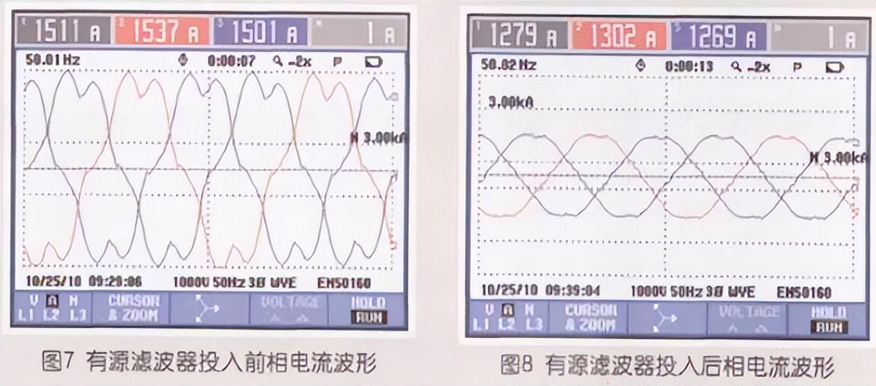3)三相电流波形前后对比,见图7、图8。