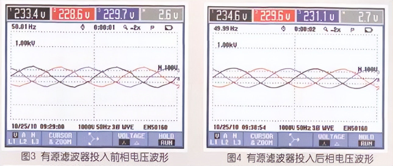 1)三相电压波形前后对比,见图3.图4。
