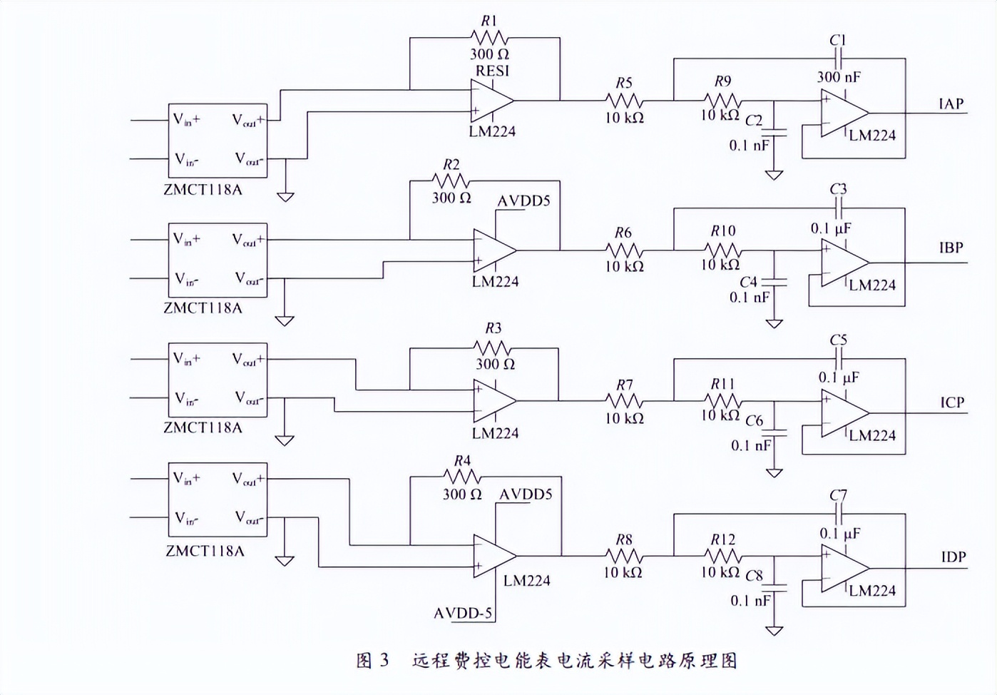 设计关键电路模块时,应基于远程费控电能表的基本架构。其中远程费控电能表信号处理模块主要是依赖数据采集ADC模块来进行采样。采样功能以电流采样电路为例进行说明,该电路是将各相电流进行转换,其基本原理是依靠电流互感器,将电路的一侧接地,另一侧与系统相连接来完成采样。其具体原理图如图3所示。由于对计量芯片的要求是保证2.5mA的电流幅值,因此通过该采样电路可将5A电流转换成2.5mA的电流,完成电流-电压的转换目的。