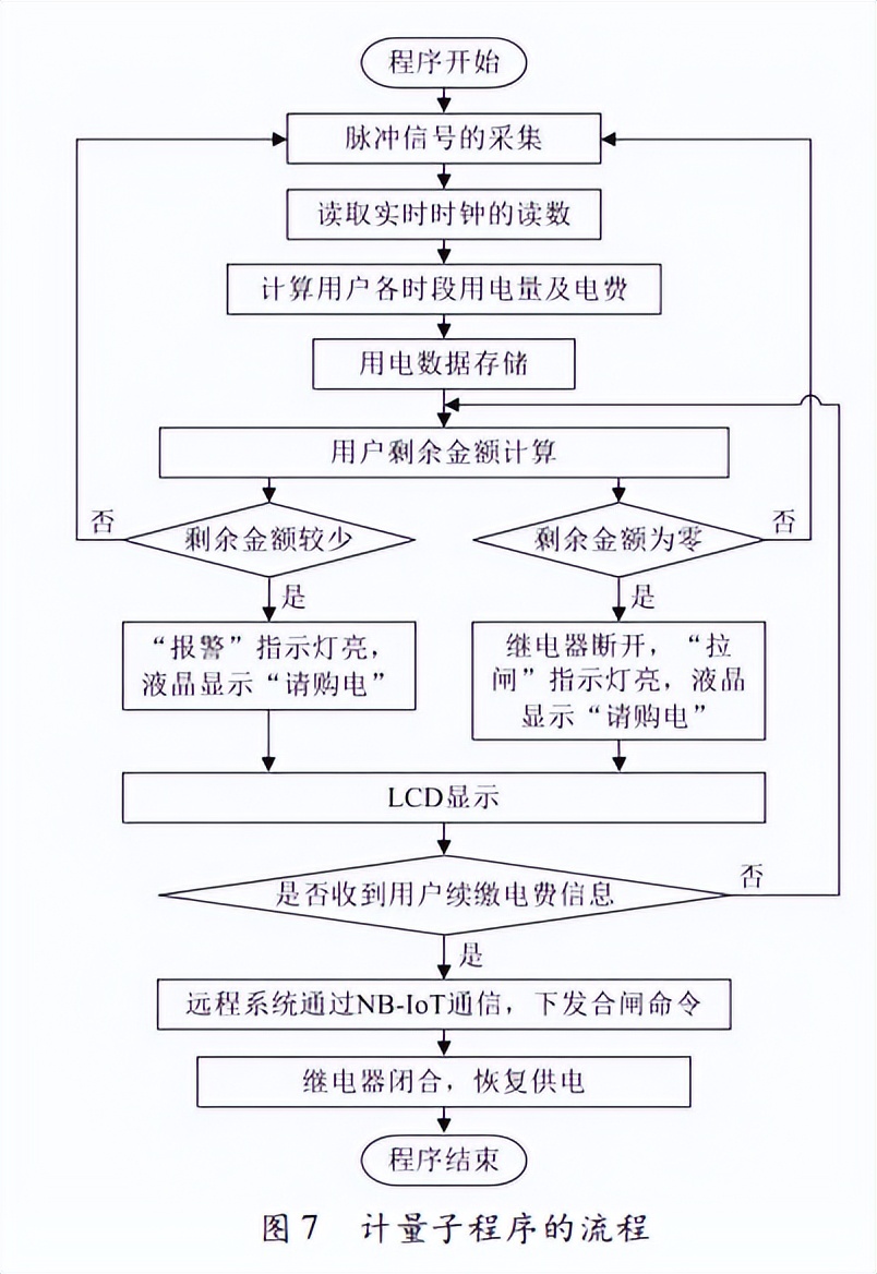 远程费控电能表的计量子程序,主要用来完成对实时时钟数据的读取以及用户端使用电量的分阶段计量。在电能计量方面,子程序要分别针对有功电能、无功电能进行计量,具有正向有功、反向有功电能计量功能,可设置、组合有功电能;而无功电能可设置成任意4个象X量之和,并可设置、组合无功电能。信号处理程序首先要求电能表使用者进行安全认证;其次依照初始化命令对电能表进行初始化工作,对电能表进行模式选择;然后启动无线通信功能,远程接收命令,并在读取芯片数据后,通过LCD将结果显示出来。远程费控电能表的计量子程序流程如图7所示。在计量费控方面,可以实现远程费控和本地费控的功能。当电能表的金额小于设定的报警金额,电能表的LCD屏会显示或者报警灯亮起,提醒用户续缴电费。