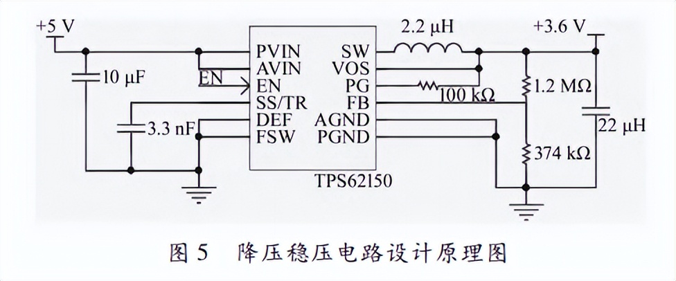NB-IoT无线通信模块采用移远公司的BC95-B5通信模组,该通信模组具备超低功耗的特点,接收频率保持在869~894MHz,发送频率的范围为824~849MHz,该模组可扩展串口、内置芯片式用户身份识别(embeddedsubscriberidentitymodule,eSIM)卡接口等应用接口。模组内部不仅包含Flash和静态随机存取存储器(staticrandom-accessmemory,SRAM),还拥有射频电路和eSIM卡座电路。该无线通信模块的降压稳压电路如图5所示。