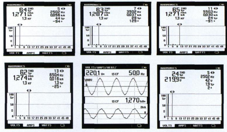 6#变压器负载主要是动力车间的4台空压机、2台真空泵及除尘系统,这些设备使用了大功率变频器。变频器作为典型的非线性负载,在工作过程中同时也是谐波源,发出了大量的谐波电流,导致变压器副边侧电流波形发生严重奇变。6#变运行负荷电流在1800A左右,在设备正常运行状态下测试,5次谐波达到223A、7次谐波达到73A、11次谐波达到49、13次谐波达到22A、17次谐波达到23A,电流畸变率达到13.5%,总谐波电流达到1800X13.5%=243A从测试图上看电流波形已经出现严重踏变,电能质量受到了非常严重的影响,在变压器副边制并联接入2台150A有源滤波装置对谐波进行集中治理。