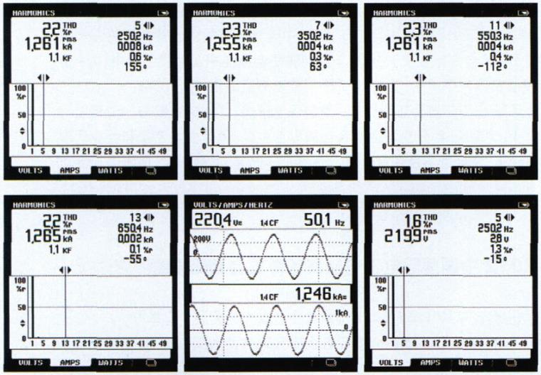 4#变压器负载主要是动力车间21组空调机组,每组空调机组有2-3台75kW变频器变赖器作为典型的非线性负载,在工作过程中同时也作为谐波源,发出了大量的谐波电流,导致变压器副边侧电流波形发生严重畸变。4#变正常运行负荷电流在880A左右,在设备正常运行状态下测试,5次谐波电流高达185A,7次谐波达到71A,11次谐波达到37A,13次谐波达到18A、19次谐波达到14A23次谐波达到24A,电流畸变率达到23.7%,总谐波电流达到880X23.7%=208.56A。从测试图上看电流波形已经出现严重畸变,电能质量受到了非常严重的影响,在变压器副边侧并联接入两台150A有源滤波装置对谐波进行集中治理。