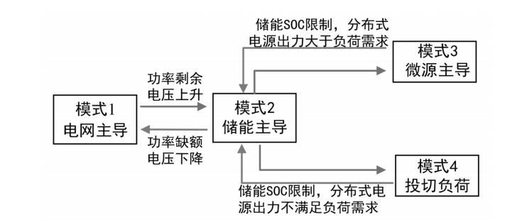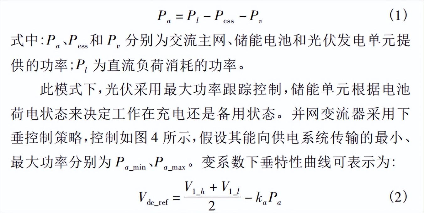 为解决上述问题,提升供电系统能效品质,本文提出了考虑电能管理的一种供电系统自治协调控制策略。并网装置通过判断微电网直流母线电压信息自适应选择控制模式并无缝切换,各并网设备采用自适应下垂控制,相互之间无需通信,具备“即插即用功能"。