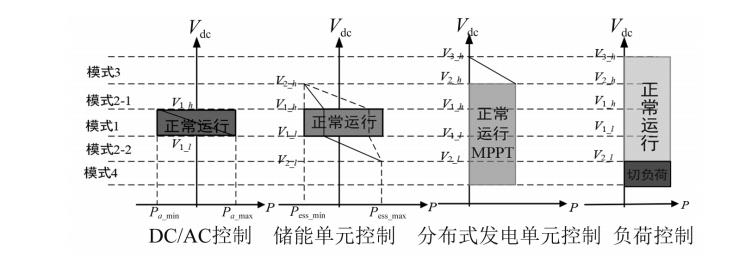 依据直流母线电压信息将直流供电系统分为电网主导和切负荷四种运行模式,如图 2 所示。考虑系统的电能优化和管理,为避免采用集中控制,基于无互联通信的控制策略如图 3 所示。