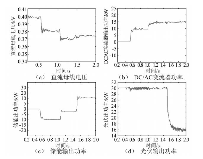 0~0.5S: 供电系统并网运行,储能处于备用状态,光伏输出功率30 kW,负荷30 kW,本地功率基本平衡,DC/AC 变流器输出功率很小,由 DC/AC 变流器控制母线电压。