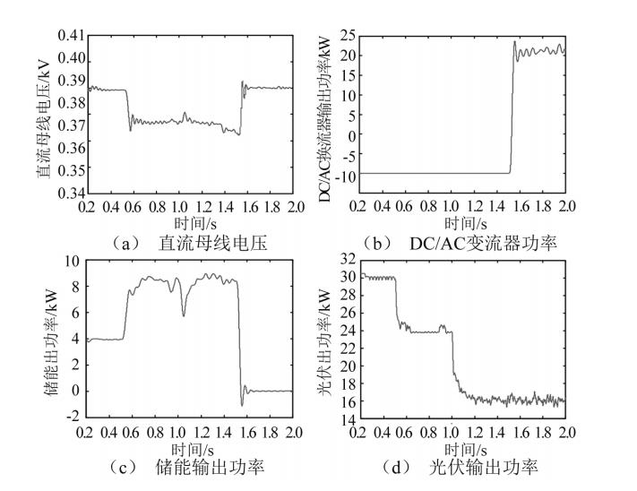 0.5~1S光伏输出功率减小,为了维持网内功率平衡,储能增大输出功率,母线电压有一定的降低。