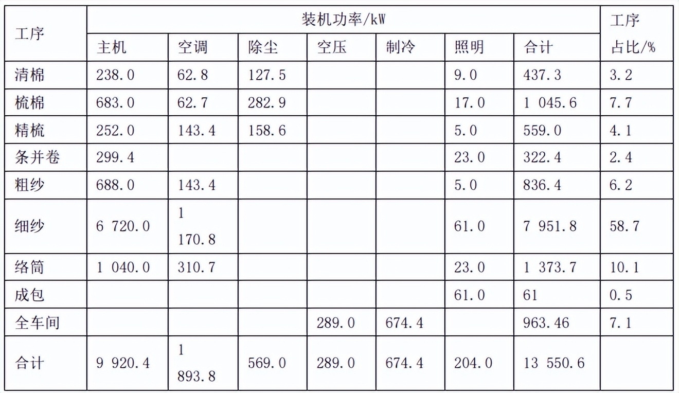 从表1可以看出,包含制冷设备时,合计总功率13550.6kW,其中各设备装机功率占比为:主机73.2%,空调14.0%,除尘4.2%,空压2.1%,制冷5.0%,照明1.5%。由于近年来纺织设备自动化程度不断提高,清梳联工序装机功率有较大提高。按主辅机计算,车间主机设备装机功率占比73.2%,空调设备占比14%,除尘设备占比4.2%,空压制冷设备占比7.1%。按工序计算,清梳联工序占比11%,精并粗工序占比12.7%,细纱工序占比58.7%,络筒工序占比10.1%。由于制冷设备在夏季*热月视情况运行,按常年运行设备分类,主机设备装机功率占比77%,空调除尘装机占比18.2%,除主机设备外空调除尘是能源消耗大户。
