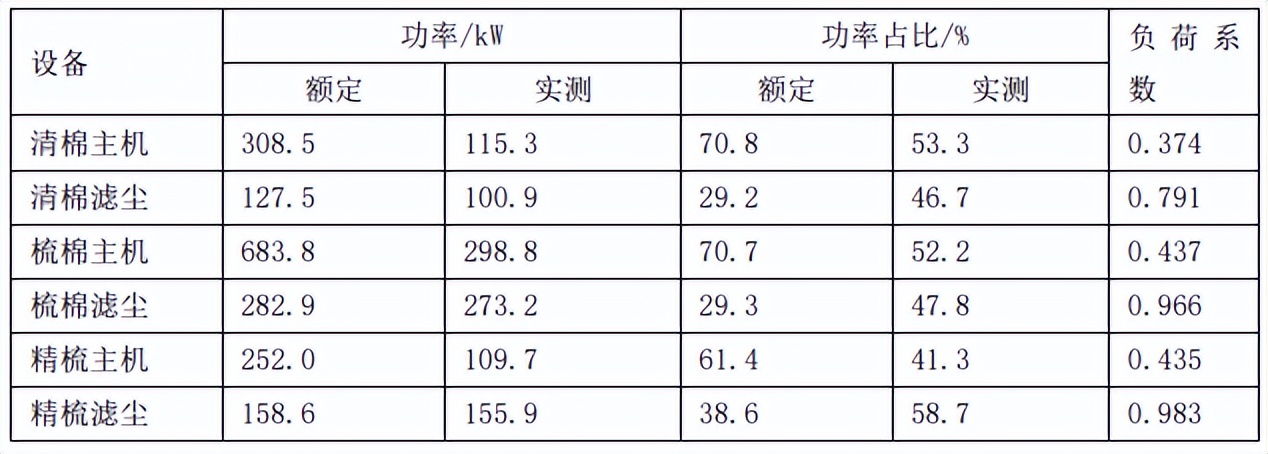 为了进一步分析除尘设备和服务主机的能耗情况,对清棉、梳棉、精梳主机设备安装功率和配套除尘设备功率进行统计,在车间主机设备全开、滤尘设备正常运行的情况下,测定对应的实耗功率,如表3所示。