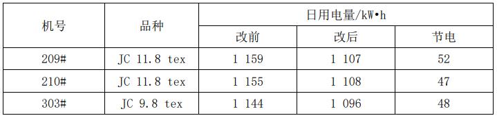 细纱集聚纺负压风机都是在高负压值下运行,这样不但能耗较高,电器设备长期满负荷运行,大大缩短了使用周期,增加了保养工作量。通过大量试验,把负压值做适量调整,在满足生产工艺要求的情况下,可以降低负压风机的运行频率,达到减负降耗的目的。在满足工艺生产的情况下,对两个品种10台集聚纺负压风机频率进行了调节试验,细纱机301#~305#纺JC11.8tex,208#~212#纺JC9.8tex,具体能耗比较如表7所示。