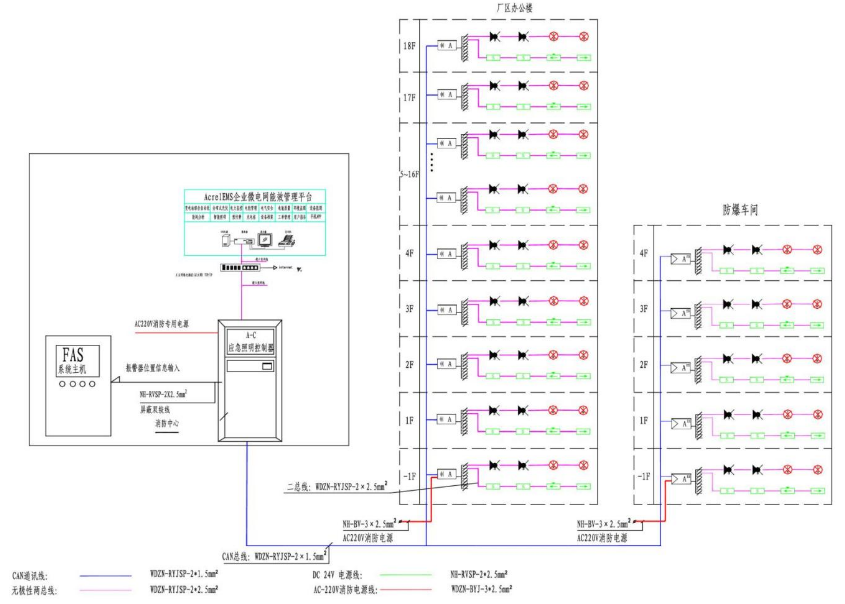 消防应急照明和疏散指示系统主要由应急照明控制器、消防应急照明集中电源或应急照明配电箱、消防应急灯具等几部分组成。该套系统可以满足与AcrelEMS企业微电网管理云平台或火灾自动报警系统等进行数据交换和共享。