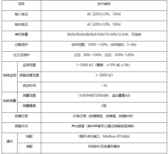 监测报警功能。后端输出线路发生过载、过欠压、绝缘,以及装置内部超温故障时,装置发出声光报警信号。