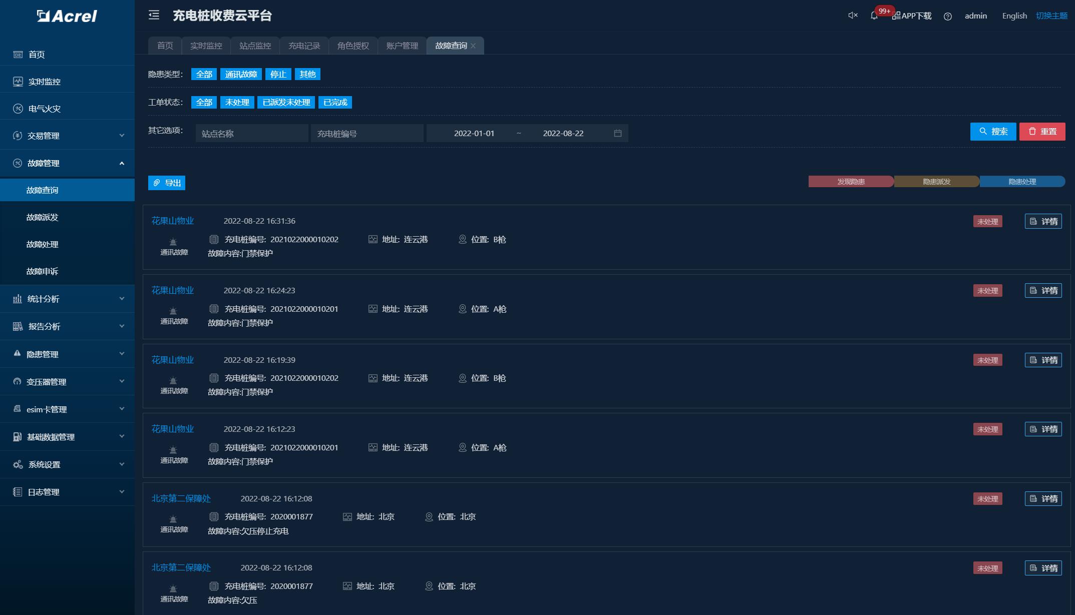 面向运维人员使用,可以对站点和充电桩进行管理、能够进行故障闭环处理、查询流量卡使用情况、查询充电\充值情况,进行远程参数设置,同时可接收故障推送