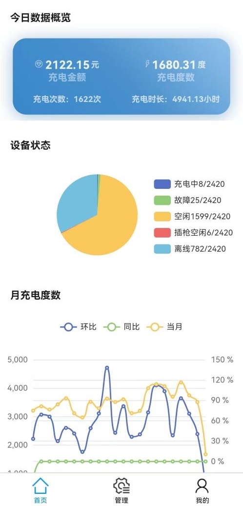智能化大屏展示站点分布情况,对设备状态、设备使用率、充电次数、充电时长、充电金额、充电度数、充电桩故障等进行统计显示,同时可查看每个站点的站点信息、充电桩列表、充电记录、收益、能耗、故障记录等。统一管理小区充电桩,查看设备使用率,合理分配资源。