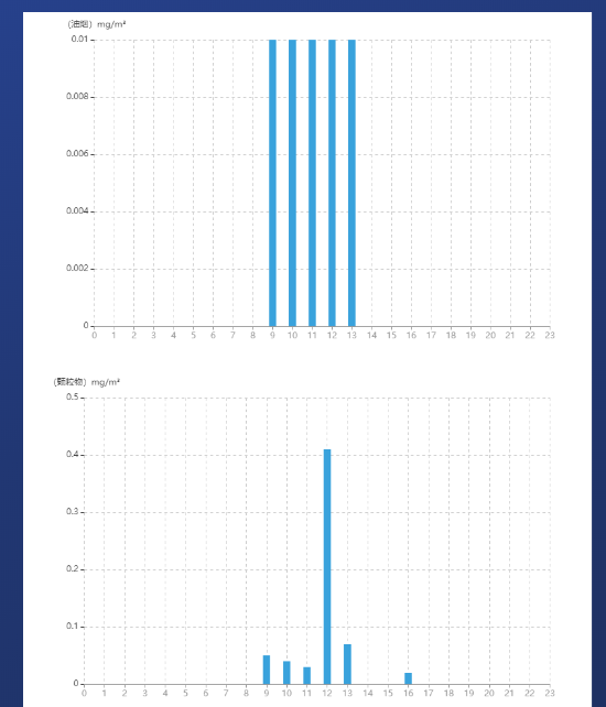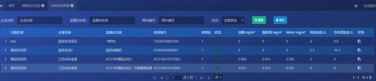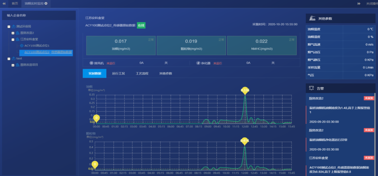 实时监测数据包括油烟净化器和风机的运行电流,油烟浓度、颗粒物浓度和NMHC浓度等信息。