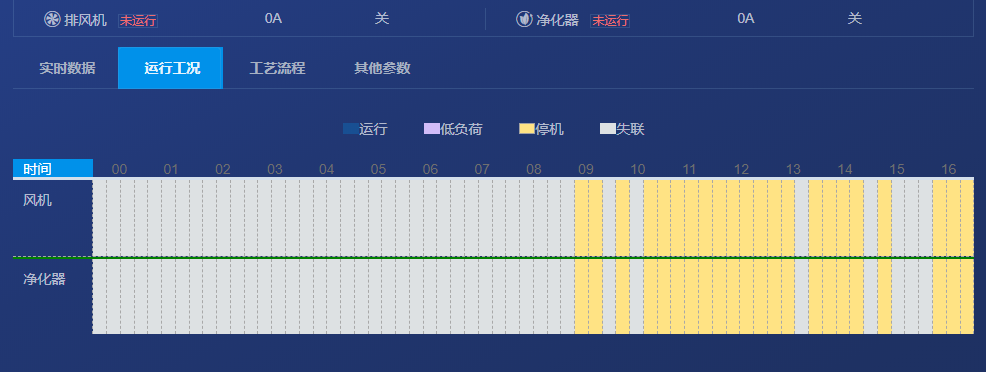 实时监测数据包括油烟净化器和风机的运行电流,根据电流数值来判断当前进化器的运行状态,包括失联、停机、运行等状态,结合运行数据曲线,更加方便直观。