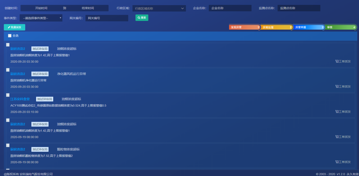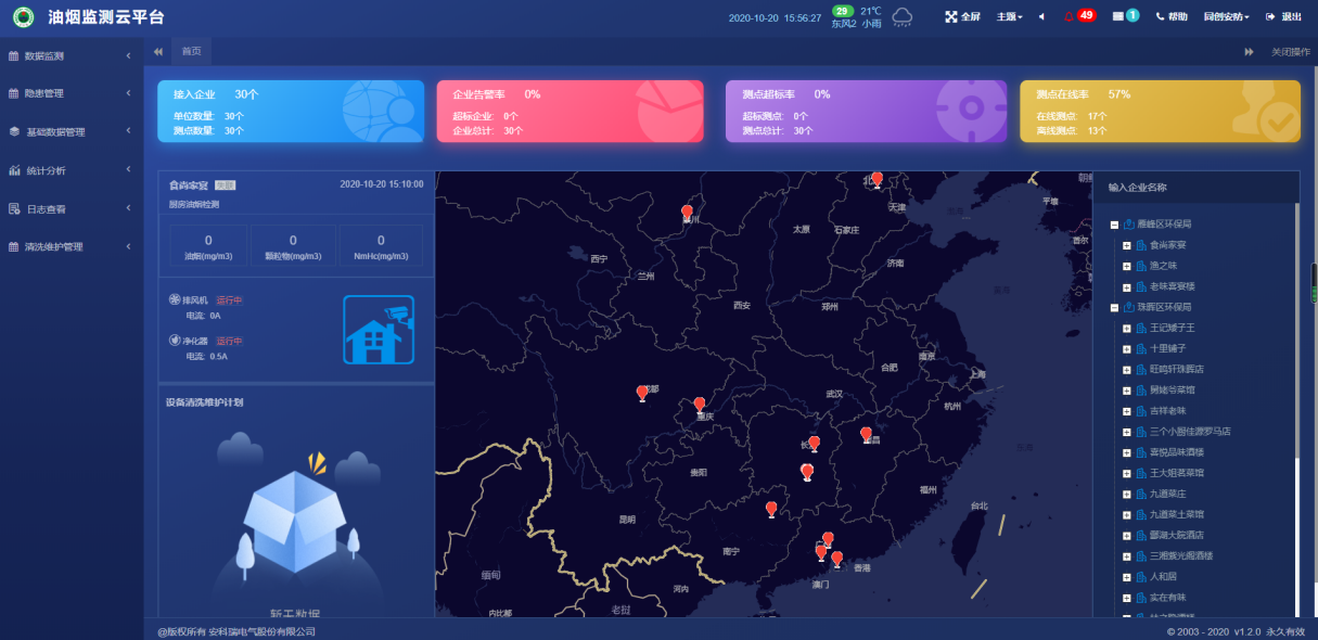 餐饮油烟监测平台GIS地图采集餐饮油烟处理设备运行状态和油烟排放的浓度数据,自动对超标排放及异常企业进行提示预警,监管部门可迅速进行处理,督促餐饮企业整改设备,并定期清洗、维护,实现减排环保,不扰民等目的。