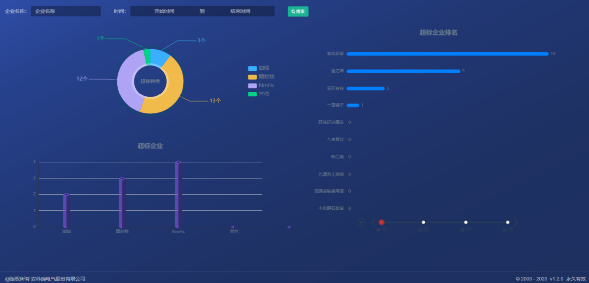 对相关的采集数据油烟、颗粒物、NMHC数据进行关联分析,对超标的种类、企业进行饼状图的展示,同时对报警企业进行排名,根据排名情况对相关企业进行数据和运行状态的分析评价。