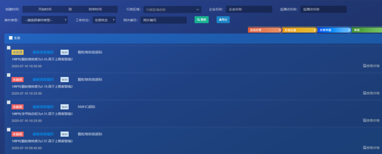 1)后台根据测点设置的浓度阈值以及门X时间在隐患巡查中产生对应的报警信息,并在首页进行铃铛和语音提示;