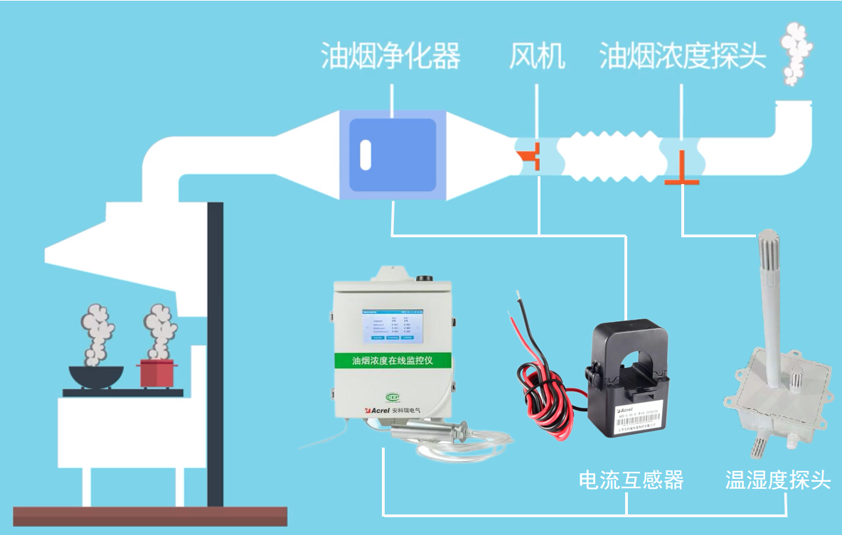 AcrelCloud-3500餐饮油烟监测平台可对餐饮点位进行不间断的数据跟踪与统计分析,在发生油烟浓度预警时,信息可多种途径及时通知相关单位处理,确保油烟等污染物的正常排放,让超标浓度无处可藏,防患于未然。针对各餐饮点位开云官方端网站登录入口通过加装多种产品可以进行检测,主要有ACY100型号餐饮油烟监测设备,外加装电流互感器及温湿度探头。