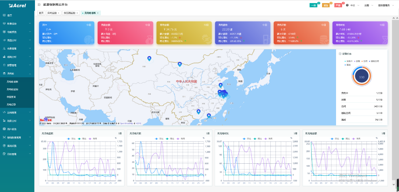 通过物联网技术,对接入系统的充电桩站点和各个充电桩进行不间断地数据采集和监控,同时对各类故障如充电机过温保护、充电机输入输出过压、欠压、绝缘检测故障等一系列故障进行预警。云平台包含了充电收费和充电桩运营的所有功能,包括城市级大屏、交易管理、财务管理、变压器监控、运营分析、基础数据管理等功能。