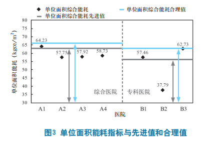 2.3.1 单位面积能耗指标。图3给出了7所医院的单位面积综合能耗值以及与合理值和先进值要求[≤56 kgce/(m2 ·a)],B3医院单位面积能耗与合理值限值差距*小。