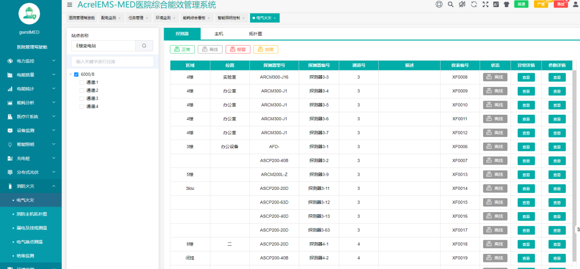 医院电气火灾监控系统以建筑为单位设置,采集数据后上传至值班室监控主机,实现对建筑电气安全预警。现场设置的传感器监测配电系统回路的漏电电流和线缆温度,异常时实时发出报警信号,关注门诊楼、住院楼、医技楼等区域漏电或者电缆发热等问题。
