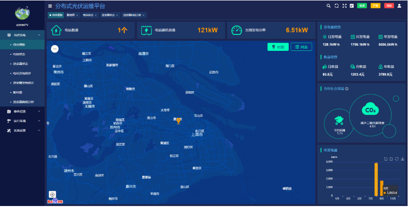 ●显示所有光伏电站的数量,装机容量,实时发电功率。