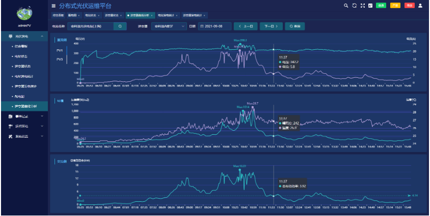 ●展示交、直流侧电压、功率、辐照度、温度曲线。