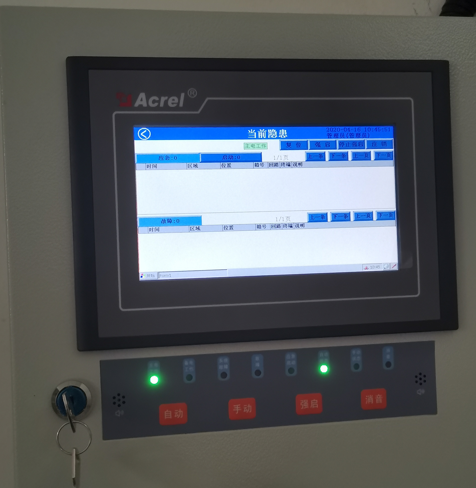 手动按键:将系统从自动监控状态切换至手动控制状态,按下面板的“强启"按键,可进入应急状态;
