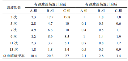 表3为有源滤波装置开启前后谐波电流百分比