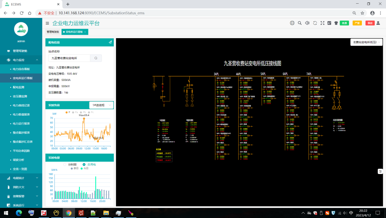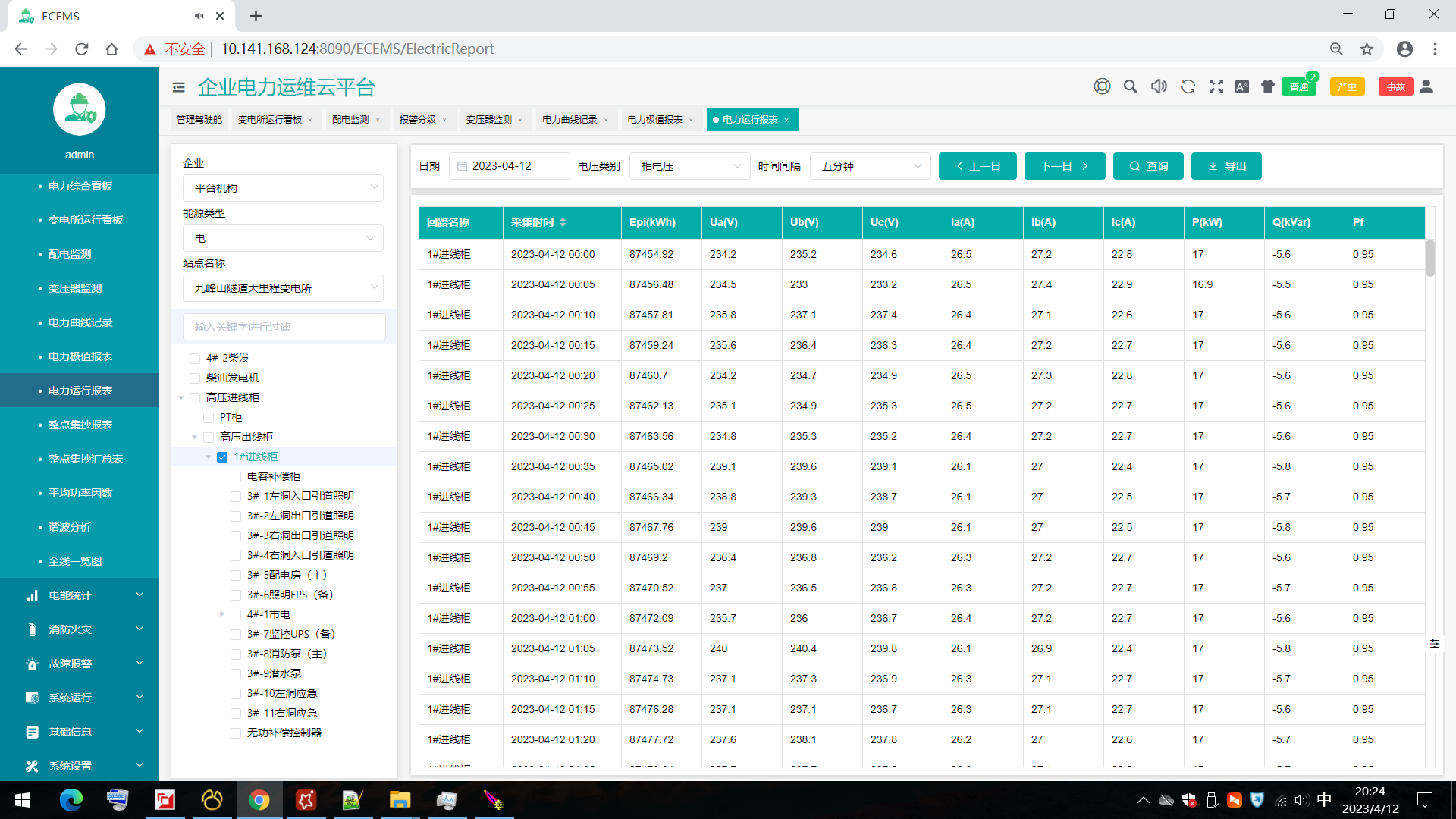 电参量查询:在配电一次图中,可以直接查看该回路详细电参量,包括三相电流、三相电压、总有功功率、总无功功率、总功率因数、正向有功电能等。