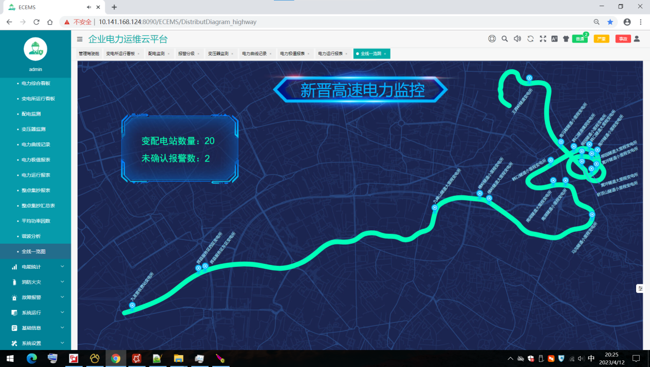 全路段监控:沿途数十几个配电房绘制在一张K线图里面,点击每个站跳转相关配电图画面显示,使整条高速公路的配电系统一图掌握。