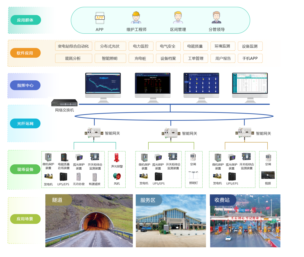 AcrelEMS-HIM高速公路综合能效管理系统为高速公路能源管理提供的监测及控制,主要包括电力监控、电气消防、能耗分析、电能质量监测和治理、环境监控等功能。其中电力监控系统及电气火灾监控系统主要设置于各隧道、收费站、服务区等场区的供配电系统,便于运营维护人员对高速公路沿线供配电设施的运营状况实时检测,能够及时发现电气安全隐患及电气故障,并能够对场区用电数据进行报表及统计。有效降低工作人员劳动强度、提高工作效率、避免人为事故发生、有序保证高速公路可靠运行。