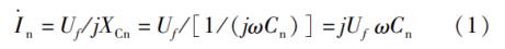 式中:In为注入电源在正常线路中产生的漏电流的向量;Uf为频率f的注入电源产生的母线对地电压;j为旋转90°因子,表示顺时针旋转90°;XCn为总的对地电容;ω为角速度,ω=2πf;Cn为负载支路的对地电容。