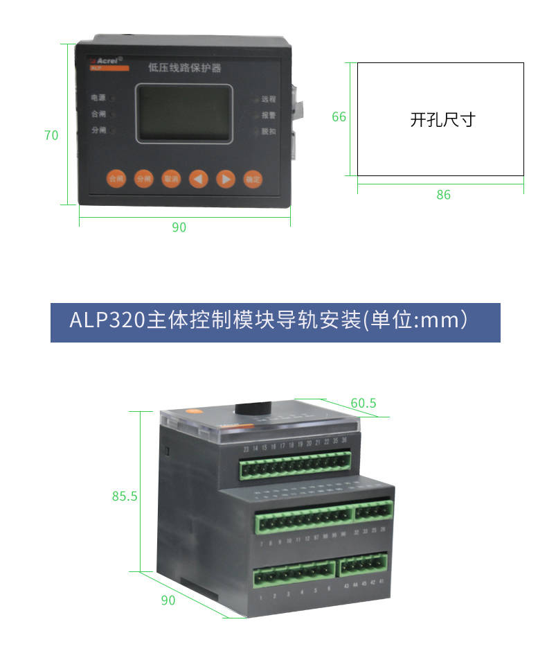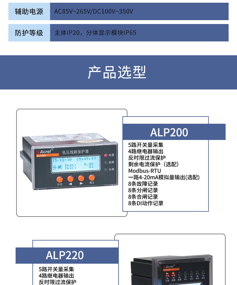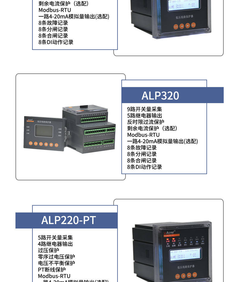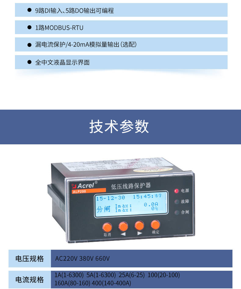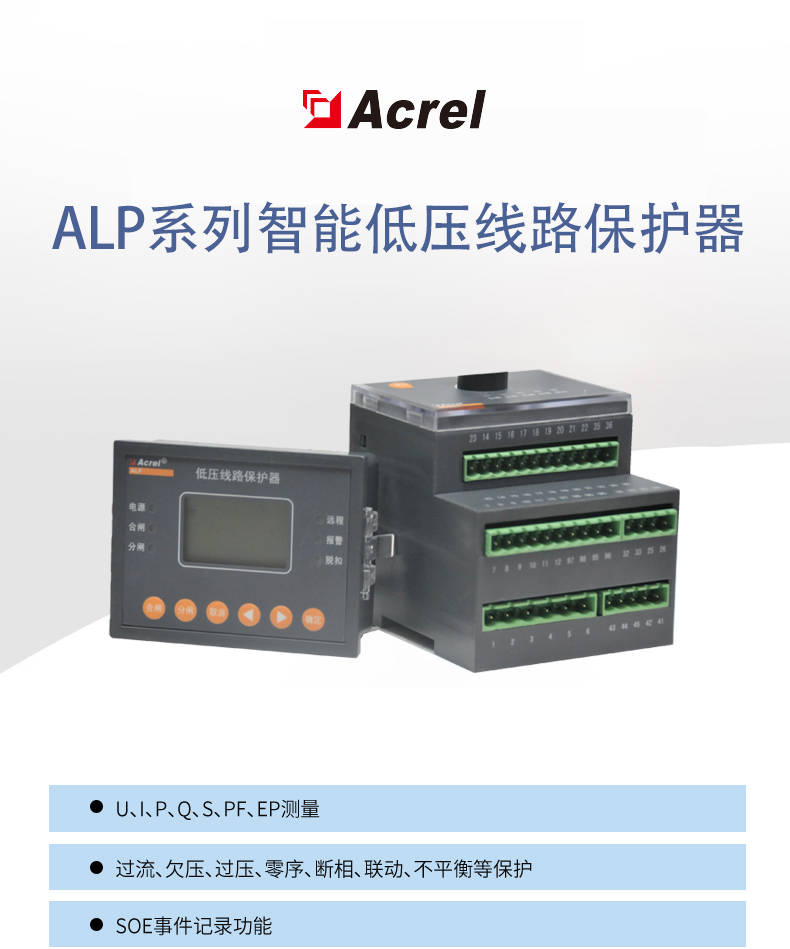 ALP200、ALP220、ALP320 系列智能型低压线路保护器(以下简称ALP),适用于额定电压至AC 660V、额定电流至 AC 400A、额定频率为 50/60Hz 的低压系统。产品体积小,结构紧凑,安装方便,是低压馈线终端的保护、监测和控制的智能化综合装置。 ALP 系列产品集保护、测量、控制、总线通讯为一体,同时提供了远程自动控制、现场直接控制、面板指示、信号报警、操作记录、跳闸报警记录及开关量记录等功能。适用于煤矿、石化、冶炼、电力、船舶、以及民用建筑等领域。