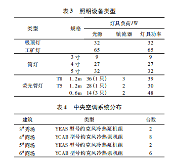 商场的分类能耗包含水、电和天然气。水和天然气的主要消费对象是餐饮建筑。餐饮建筑的能耗由餐饮公司运营管理,能耗管理系统仅统计每月总能耗数据。会所用电设备主要包括照明、分体式中央空调系统分布如表4所示。