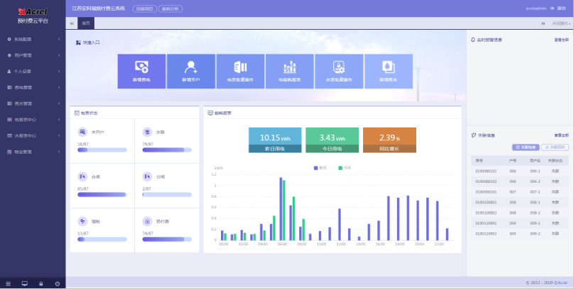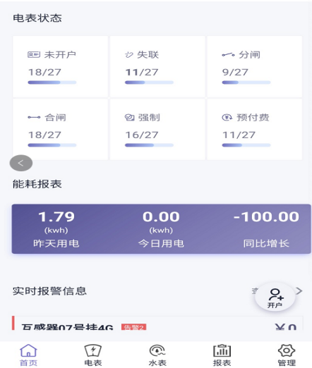 提供快捷的操作入口,包括:售电管理;新表开户;电表批量操作;能耗统计报表;水表批量操作;售水管理等。