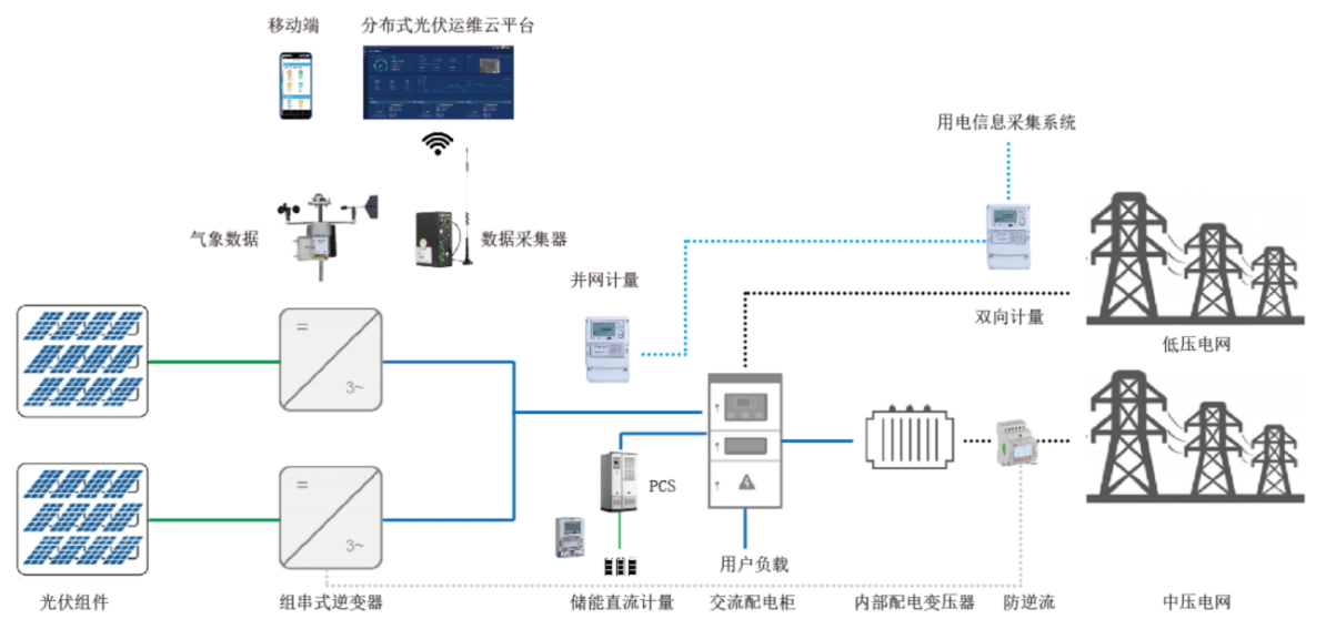 光伏阵列接入组串式光伏逆变器,或者通过汇流箱接入逆变器,然后接入企业380V电网,实现自发自用,余电上网。在380V并网点前需要安装计量电表用于计量光伏发电量,同时在企业电网和公共电网连接处也需要安装双向计量电表,用于计量企业上网电量,数据均应上传供电部门用电信息采集系统,用于光伏发电补贴和上网电量结算。