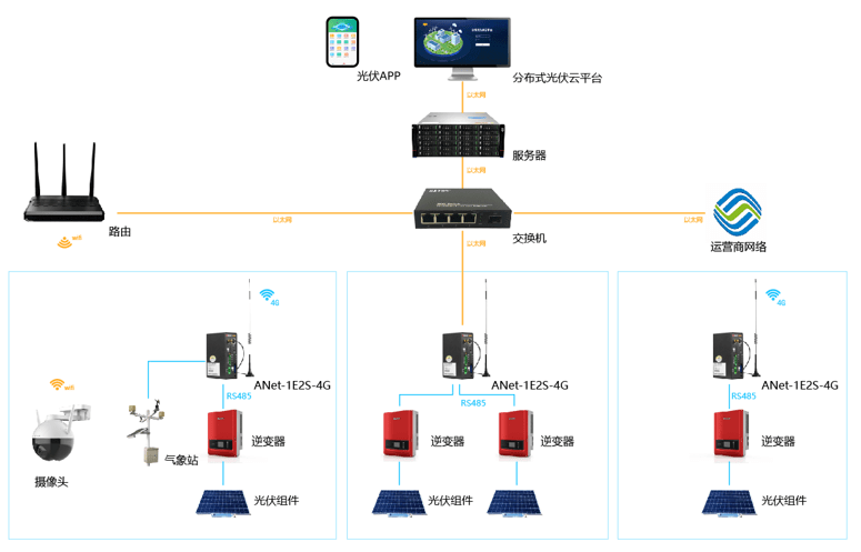部分小型光伏电站为自发自用,余电不上网模式,这种类型的光伏电站需要安装防逆流保护装置,避免往电网输送电能。光伏电站规模较小,而且比较分散,对于光伏电站的管理者来说,通过云平台来管理此类光伏电站非常有必要,开云官方端网站登录入口在这类光伏电站提供的解决方案包括以下方面: