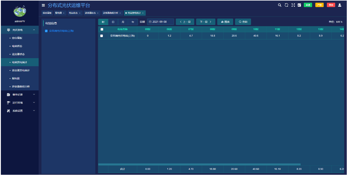 ●展示所选电站的时、日、月、年发电量统计报表。