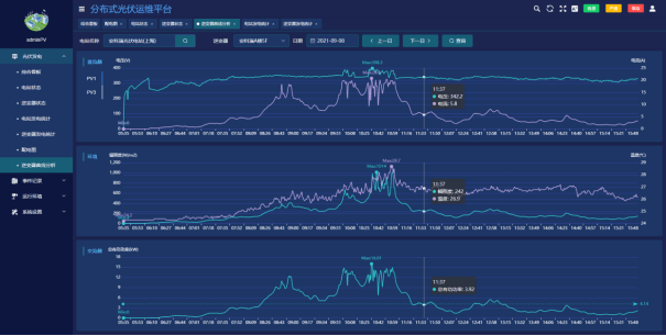 ●展示交、直流侧电压、功率、辐照度、温度曲线。