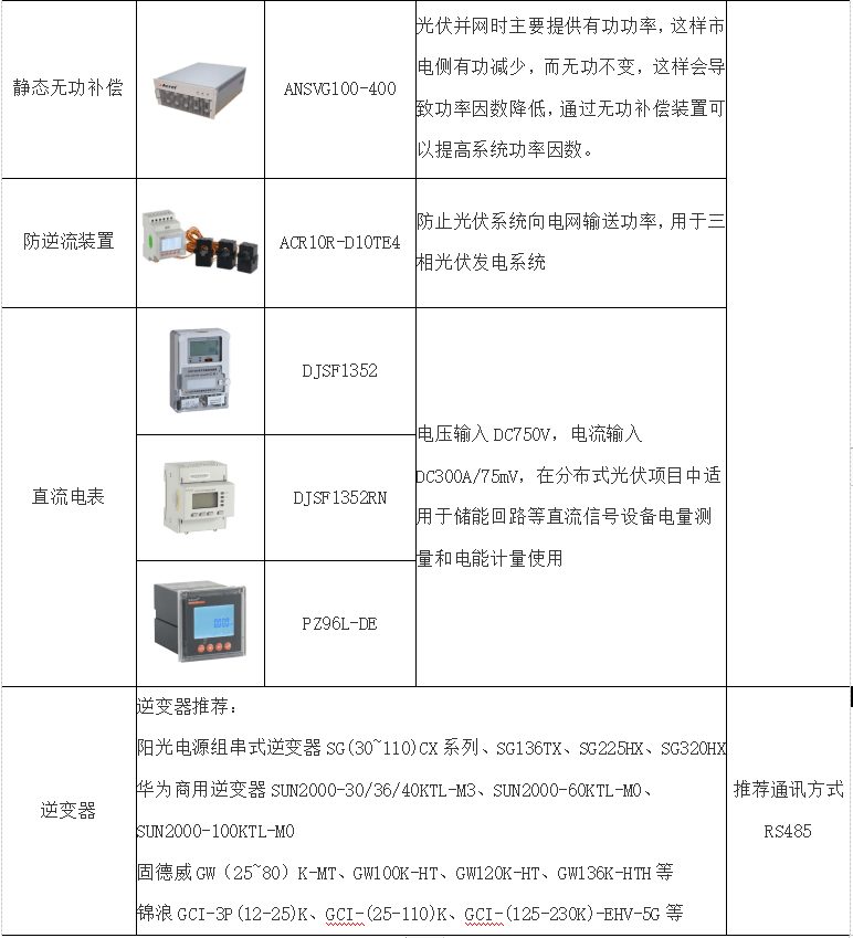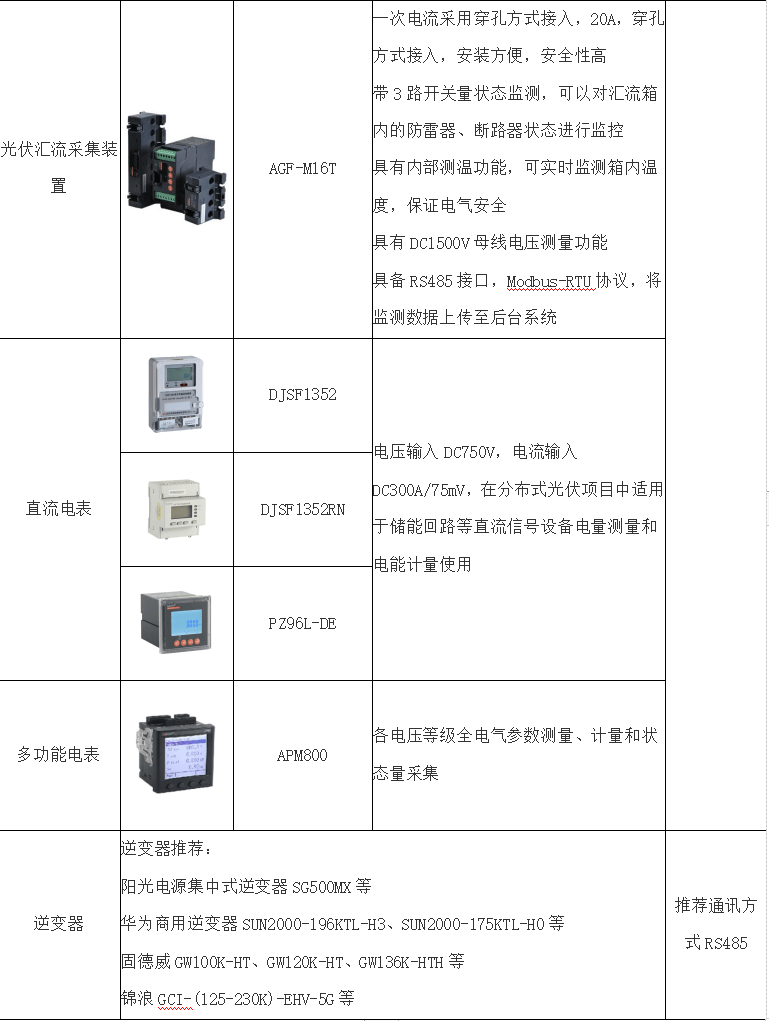 上图为一个1MW分布式光伏电站的示意图,光伏阵列接入光伏汇流箱,经过直流柜汇流后接入集中式逆变器(直流柜根据情况可不设置),最后经过升压变压器升压至10kV或35kV后并入中压电网。由于光伏电站装机容量比较大,涉及到的保护和测控设备比较多,主要如下表: