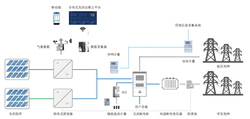 光伏阵列接入组串式光伏逆变器,或者通过汇流箱接入逆变器,然后接入企业380V电网,实现自发自用,余电上网。在380V并网点前需要安装计量电表用于计量光伏发电量,同时在企业电网和公共电网连接处也需要安装双向计量电表,用于计量企业上网电量,数据均应上传供电部门用电信息采集系统,用于光伏发电补贴和上网电量结算。